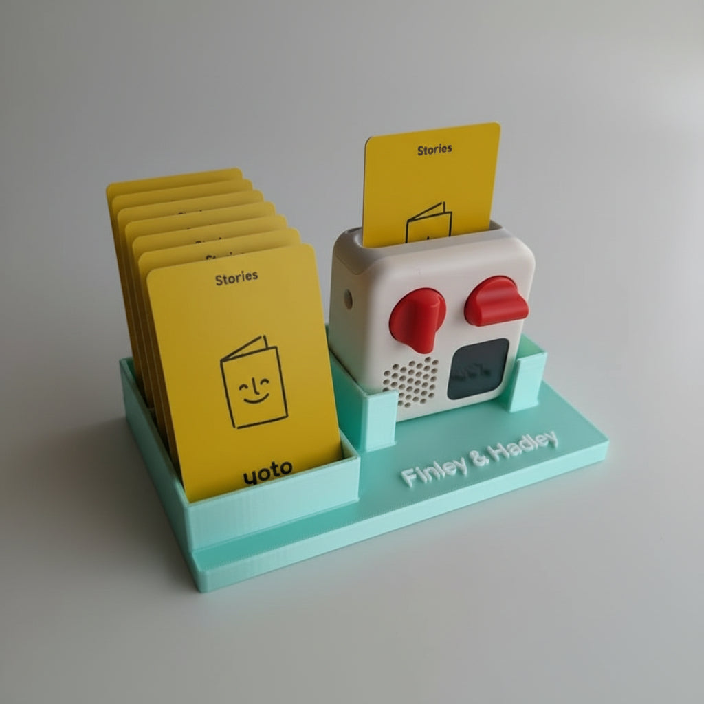 Custom made stand for the yoto player to hold the player and display cards.